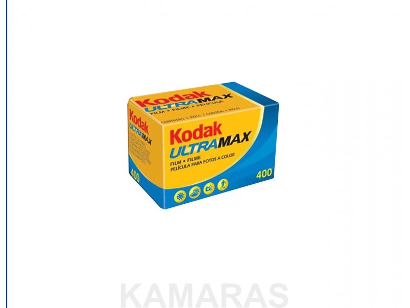 Kodak UltraMax 400 es una película negativa en color con balance de luz diurna de alta velocidad que ofrece una amplia latitud de exposición para una mayor versatilidad, así como una estructura de grano fino con colores consistentes y precisos. La reproducción optimizada del tono de la piel hace que esta película sea adecuada para los retratos, mientras que una paleta de colores vibrante en general beneficia a la fotografía general y al aire libre. Tiene una sensibilidad nominal de ISO 400/27 ° y es ideal para aplicaciones de escaneo y ampliación.