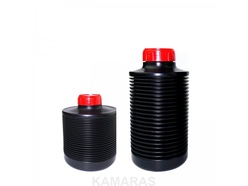 Las soluciones fotoquímicas reaccionan con el oxígeno, por lo que se alteran fácilmente cuando se conservan en recipientes medio llenos. El fuelle de estas botellas se comprime para evitar este efecto, eliminando el aire y adaptándose siempre al volumen del contenido, por lo que siempre pueden estar llenas.