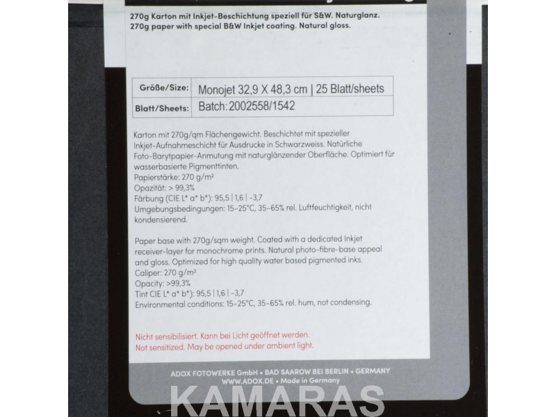 ADOX FIBRE MONOJET es un material de inyección de tinta optimizado para la reproducción de imágenes en blanco y negro.