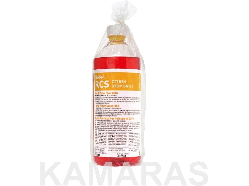ROLLEI CITRIN STOP (RCS) es un baño de paro a base de ácido cítrico para películas, papeles RC y papeles baritados. Inodoro. Dilución: 1 + 19.