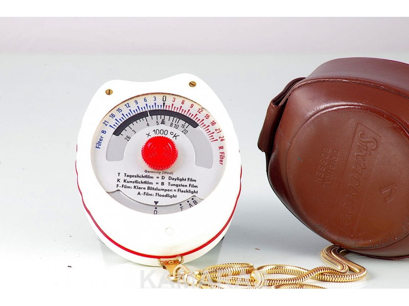Fotometro termocolorimetro clasico con tecnologia de selenio (sin baterias), ofrece lecturas correctisimas de temperatura de color y grados de filtraje para peliculas luz dia y tungsteno, todo funciona correctamente, se suministra con estuche de piel original y cadena de laton.