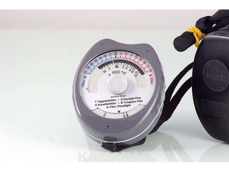 Fotometro termocolorimetro clasico con tecnologia de selenio (sin baterias), ofrece lecturas correctisimas de temperatura de color y grados de filtraje para peliculas luz dia y tungsteno, todo funciona correctamente, se suministra con estuche de piel original y cinta de nylon.