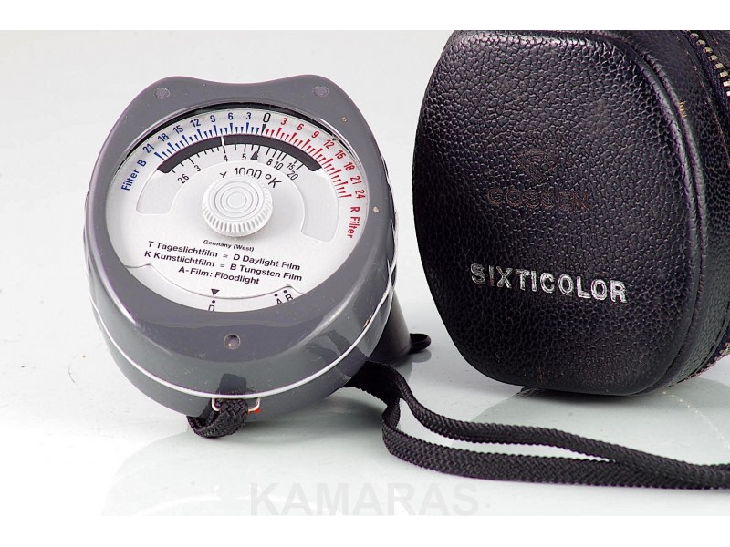 Fotometro termocolorimetro clasico con tecnologia de selenio (sin baterias), ofrece lecturas correctisimas de temperatura de color y grados de filtraje para peliculas luz dia y tungsteno, todo funciona correctamente, se suministra con estuche de piel original