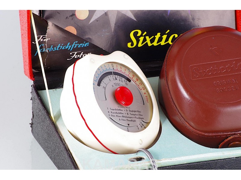 Fotometro termocolorimetro clasico con tecnologia de selenio (sin baterias), ofrece lecturas correctisimas de temperatura de color y grados de filtraje para peliculas luz dia y tungsteno, todo funciona correctamente, se suministra con estuche de piel original y cadena de laton.
