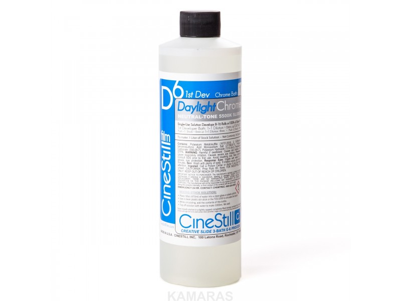 El primer desarrollador D6 “DaylightChrome” de tono neutro 5500K es uno de los primeros desarrolladores del proceso de 3 baños Cs6 “Creative Slide”. Genera aproximadamente más de 6 pasos de rango dinámico utilizable, con blancos más brillantes y saturación de color moderadamente mejorada, al igual que el procesamiento E6 convencional. Luz diurna equilibrada de 5500 K para diapositivas en tonos neutros a la luz del día o con flash electrónico. 1000 ml de solución madre producen 2000 ml de solución de trabajo de un solo uso (dilución 1+1) para revelar hasta 16 rollos o 100 pies de película de diapositivas. Dilución 1+1 2 min a 104 °F (40 °C).