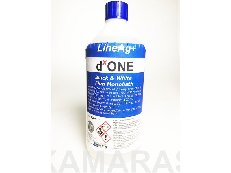 LineAg+ d(x)ONE B&W Monobath es un monobaño líquido para el procesado de película en blanco y negro. Se trata de un revelador-fijador combinado, en un solo producto y listo para usar, que revela la mayoría de las películas en seis minutos; después tan solo habrá que lavar con agua durante cinco minutos y esperar a que se seque. También puede utilizarse para procesar papel RC. El monobaño ofrece evidentes ventajas de rapidez frente al sistema clásico de tres baños, simplicando el labor de revelado in situ con cámaras estenopeicas y minuteras.