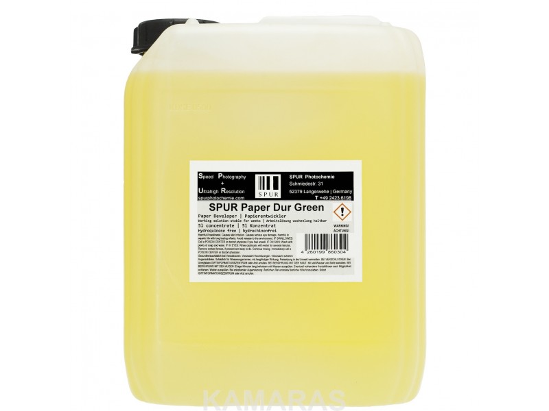 SPUR PAPER DUR GREEN Papel Revelador constante sin hidroquinona u otras sustancias nocivas para el medio ambiente. SPUR Paper Dur Öko es un revelador de papel sin hidroquinona con la mayor estabilidad a largo plazo para el revelado de papeles fotográficos en la bandeja. SPUR Paper Dur Öko es adecuado para el desarrollo de papeles que cambian de contraste y papeles con una gradación fija. SPUR Paper Dur Öko se puede adaptar de manera flexible al volumen de trabajo respectivo y la tarea respectiva seleccionando la dilución. Con una dilución de 1+4, SPUR Paper Dur Öko se puede conservar en la bandeja durante semanas. Incluso con una dilución de 1 + 7, la vida útil sigue siendo inusualmente alta. Aparte de la durabilidad y el rendimiento, las propiedades de revelado apenas se modifican con la elección de la dilución. El revelado con SPUR Paper Dur Öko tiene lugar con un tono de imagen negro neutro y se caracteriza por una buena diferenciación del valor de gris combinada con una reproducción de luz diferenciada. Incluso con bajo contraste, las sombras se reproducen como negros intensos sin ninguna tendencia al gris. Tiempos de revelado para papeles PE a 20° C: Dilución 1 + 4: 60 segundos Dilución 1 + 7: 90 segundos Los tiempos deben incrementarse en 30 segundos para papel barita. Rendimiento: Con una dilución de 1+4, se pueden desarrollar al menos 100 ampliaciones 18 x 24 (PE) por litro de solución de trabajo. Tiempos de revelado para papeles PE a 20° C: Dilución 1 + 4: 60 segundos Dilución 1 + 7: 90 segundos Los tiempos deben incrementarse en 30 segundos para papel barita. Rendimiento: Con una dilución de 1+4, se pueden desarrollar al menos 100 ampliaciones 18 x 24 (PE) por litro de solución de trabajo. Tiempos de revelado para papeles PE a 20° C: Dilución 1 + 4: 60 segundos Dilución 1 + 7: 90 segundos Los tiempos deben incrementarse en 30 segundos para papel barita. Rendimiento: Con una dilución de 1+4, se pueden desarrollar al menos 100 ampliaciones 18 x 24 (PE) por litro de solución de trabajo.