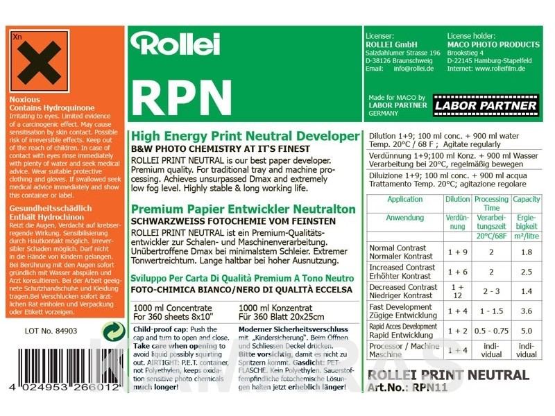 ROLLEI PRINT NEUTRAL (RPN) es el revelador de papel clásico por excelencia. Ofrece prestaciones excepcionales, tales como densidades máximas inigualables y negros intensos. Especialmente indicado para papeles baritados con alto contenido de plata. Viene en envase P.E.T. para su conservación óptima. Rendimiento: 1000 ml. concentrado = 360 hojas de 20x25 cm. Diluciones de trabajo: 1+9 (contraste normal) / 1+6 (más contraste) / 1+12 (menos contraste) / 1+4 (procesado en máquina) / 1+2 (revelado accelerado). El sucesor de LP-BROM 3