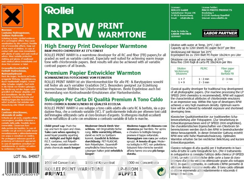 Rollei Print Warmtone (RPW) es un revelador de tono cálido compatible con todos los papeles RC y baritados de contraste variable. Consigue excelentes tonalidades con los clorobromuros. Viene en envase P.E.T. para su conservación óptima. Rendimiento: 1000 ml. concentrado = 1500 hojas de papel RC de 18x24 cm. Diluciones de trabajo: 1+9 / 1+7.
